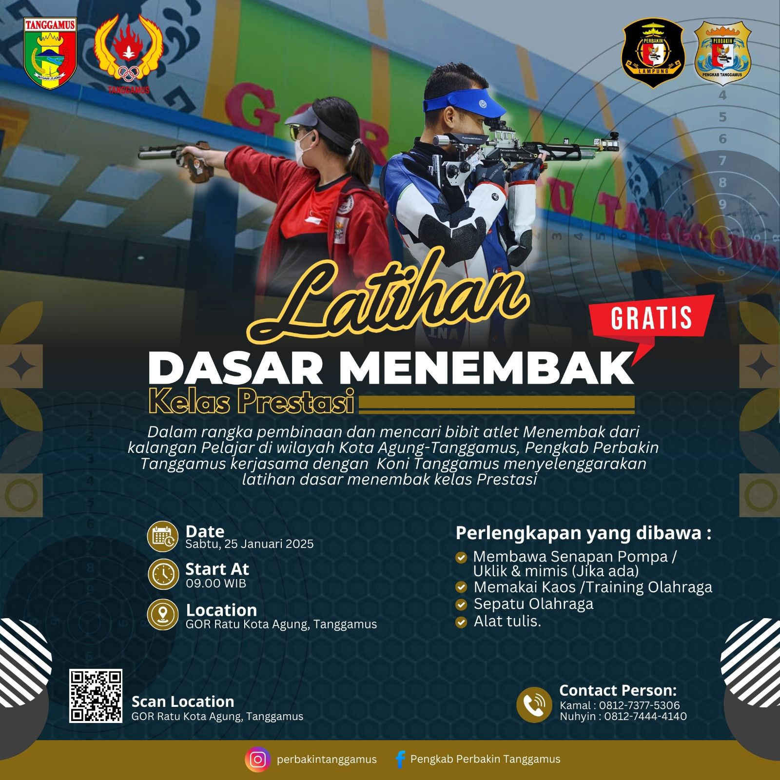Tanggamus – Pengurus Kabupaten (Pengkab) Perbakin Tanggamus bekerjasama dengan Koni Kabupaten Tanggamus dan Dispora Kabupaten Tanggamus menyelenggarakan Pelatihan Dasar Menembak Kelas Prestasi yang rencananya akan dilaksanakan di GOR Ratu Tanggamus yang terletak di Waysom, Pekon Kota Agung, Kec. Kota Agung Kab. Tanggamus pada tanggal 25Januari 2025 mendatang. Kegiatan tersebut digelar dalam rangka mencari bibit baru calon atlet menembak dari kalangan pelajar mulai dari SD kelas 5 sampai dengan SMA dalam rangka persiapan menuju Pekan Olahraga Pelajar Nasional (Popnas) 2025 dan Pekan Olahraga Provinsi (Porprov) 2026.